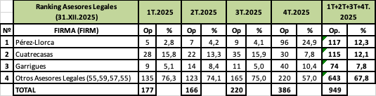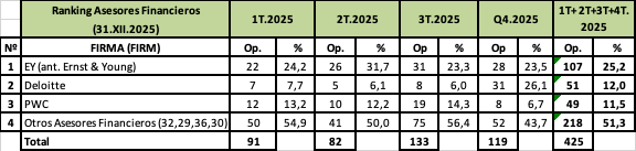 RANKING DE ASESORES LEGALES Y RANKING DE ASESORES FINANCIEROS (SEGÚN EL Nº DE OPERACIONES ASESORADAS) EN 2025