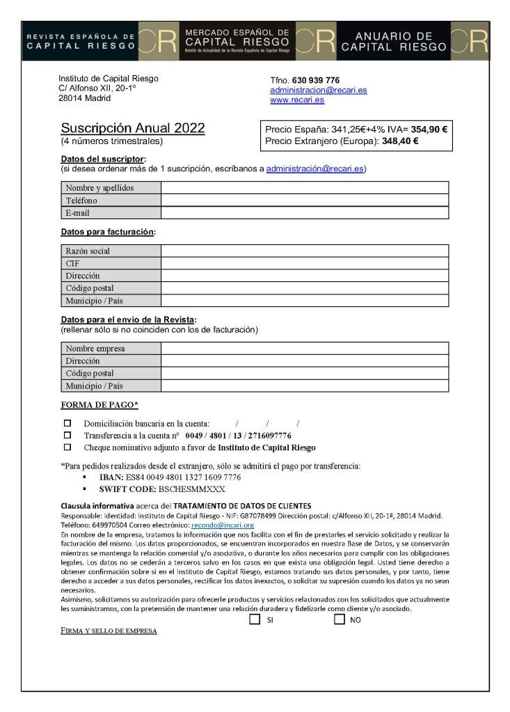 Esta base de datos analítica de capital riesgo se configura como la única y más completa realizada hasta la fecha en #España (disponibles los Boletines de CR del periodo 2012 – 2020) -, accesible una vez completados el formulario de contacto por cada interesado, que contribuirá al desarrollo e investigación de la actividad que nos atañe.