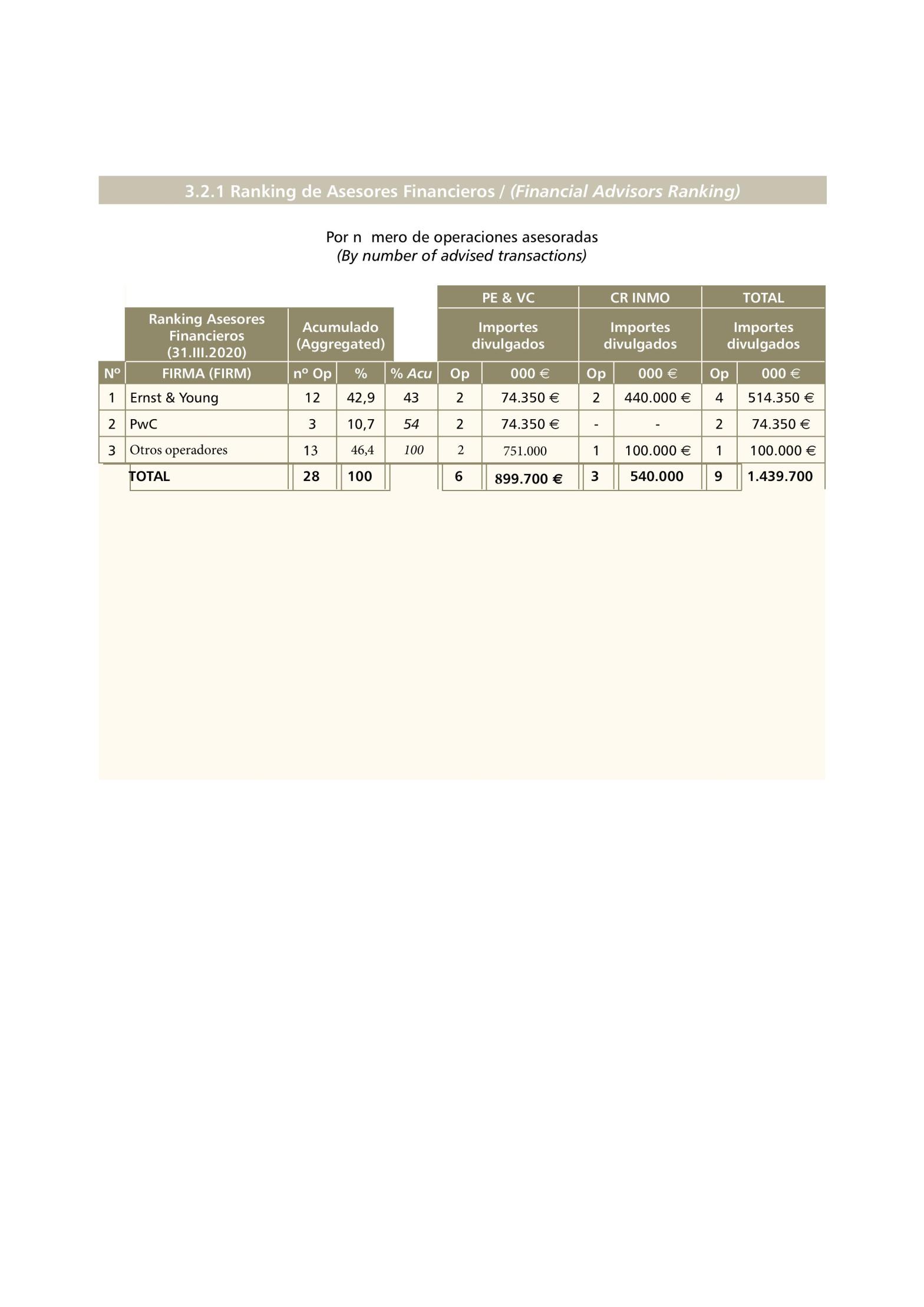 The alphabetical #financialadvisor #Ranking (extract) from the Q1.2020 (January – March) classified by the number of deal advised between a #privateequity / #venturecapital #fund and a Spanish company is presented here below.