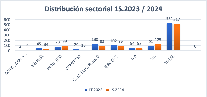 • El sector que ha recibido un mayor número de inversiones en el 1S.2024 ha sido el sector TIC (125), ubicándose el sector Industria (99) y Servicios (95), en segunda y tercera posición, respectivamente.