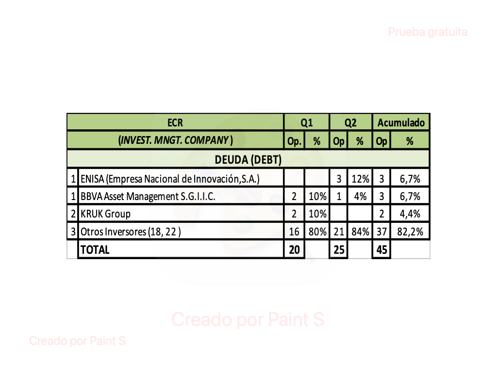 En total han sido llevadas a cabo de las 25 inversiones en el segundo trimestre que junto con las 20 del primero tres meses hacen un total de 45 operaciones y que fueron llevadas a cabo por 40 inversores diferentes y de la que se extrae una media de 1,12 compras de deuda por cada uno.