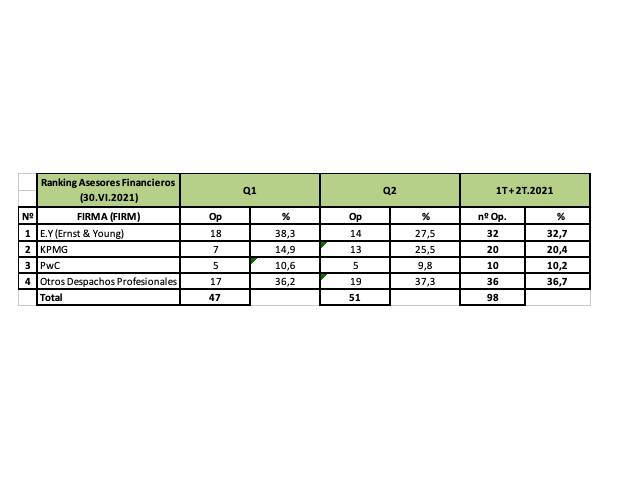 El Ranking de Asesores Financieros del 2T.2021 lo lidera EY (Ernst & Young) (32), seguido de KPMG (20) y PwC (10) en tercera posición.